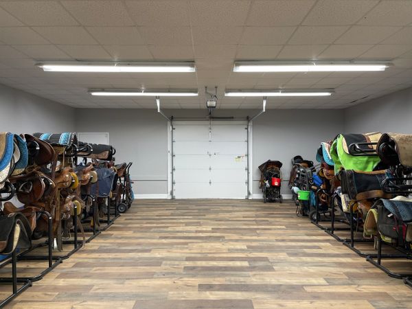 Newly renovated locked oversized tack room and lounge with ample storage and saddle racks, refrigerator, microwave, couch, AC & heater. Concrete wash rack. Hay barn for hay storage.
